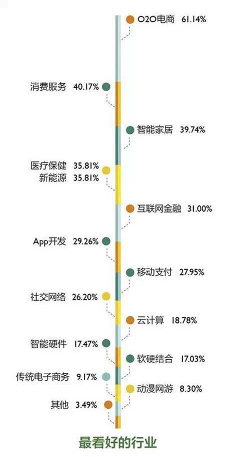 很多人認(rèn)為,在2015年,不再是在一個(gè)圈里創(chuàng)業(yè)扎根耕作,就一定能有好收成的。有20%的人依然會(huì)選擇互聯(lián)網(wǎng)(移動(dòng)互聯(lián)網(wǎng))領(lǐng)域,但這比2013和2014年比率都要低,而且選擇非互聯(lián)網(wǎng)領(lǐng)域的創(chuàng)業(yè)者已經(jīng)縮減到8%。同時(shí),絕大部分人,認(rèn)為單一虛擬的網(wǎng)絡(luò)世界基本已經(jīng)沒(méi)什么創(chuàng)業(yè)點(diǎn)了,而線下現(xiàn)實(shí)生活很多領(lǐng)域已經(jīng)成熟,又會(huì)是受到很多硬件軟件和用戶情況的限制。只有將跨領(lǐng)域的結(jié)合,才是良好的投資創(chuàng)業(yè)角度。在這其中,更多的人(61%)選擇了O2O線上線下結(jié)合的電商模式。